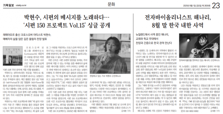 뮤직타임 [기사] 박현수, 시편 메시지 노래… ‘시편 150 프로젝트 Vol.15’ 싱글 공개(기독일보)
