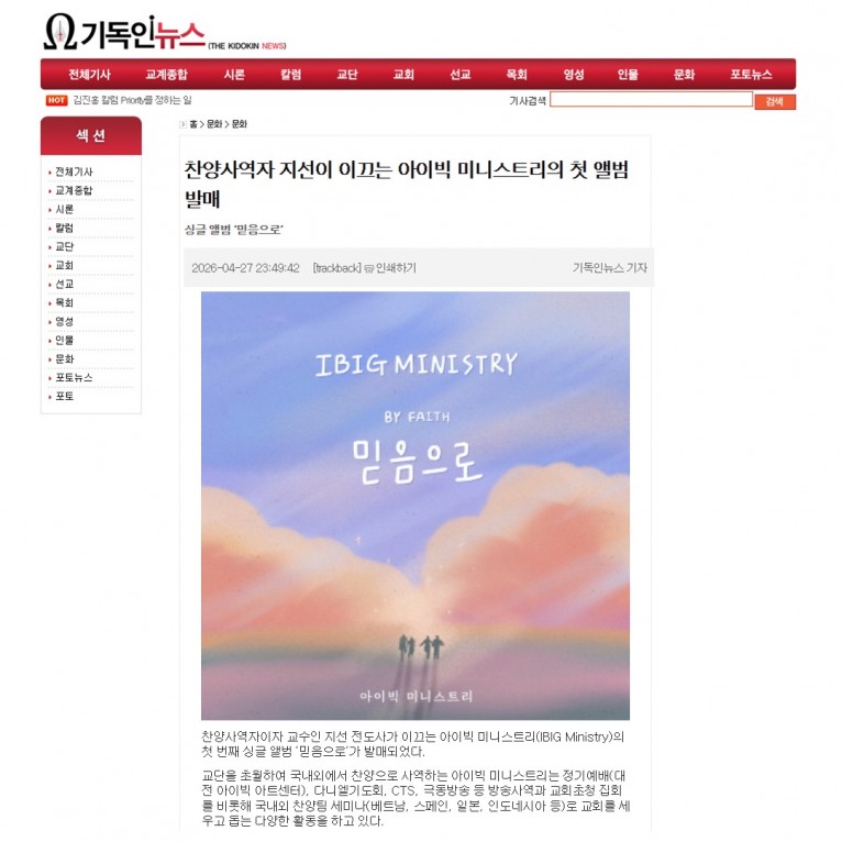 찬양사역자이자 교수인 지선 전도사가 이끄는 아이빅 미니스트리(IBIG Ministry)의 첫 번째 싱글 앨범 ‘믿음으로’가 발매되었다.
