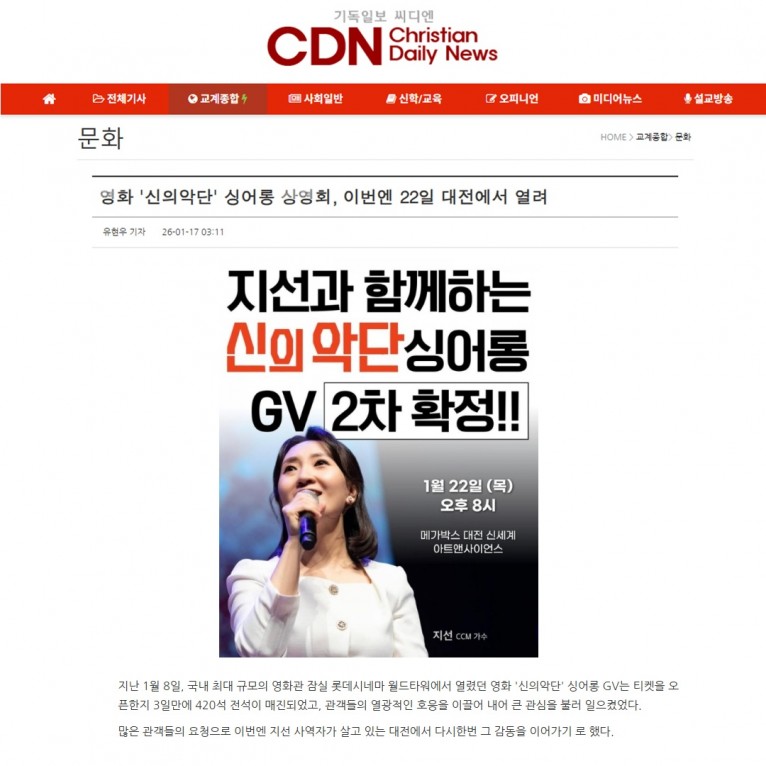 [기사] 영화 '신의악단' 싱어롱 상영회, 이번엔 22일 대전에서 열려(기독일보 씨디엔)