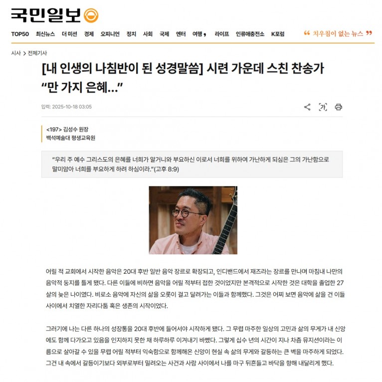 [기사] 김성수, [내 인생의 나침반이 된 성경말씀] 시련 가운데 스친 찬송가 “만 가지 은혜…”(국민일보)